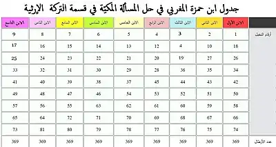 لحل المسألة وضع ابن حمزة المغربي جدولا:
