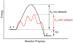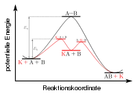 تبلغ طاقة التنشيط في حالة عدم وجود المحفز ويوضح المنحنى الأحمر مسار تل الطاقة باستخدام المحفز، حيث يسير التفاعل عبر مركب وسطي. :