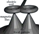 وقد تبين أن التيار المار عبر السلك يولد مجال مغناطيسي حول هذا السلك. يتم تحقيق التحفيز المغناطيسي عبر الجمجمة عن طريق تفريغ التيار بسرعة من مكثف كبير إلى ملف لإنتاج حقول مغناطيسية نابضة بين 2 و 3 تسلا.[50] يمكن للمرء إما أن يزيل استقطاب أو ينشأ فرط استقطاب في الخلايا العصبية في الدماغ، من خلال توجيه نبض المجال المغنطيسي في منطقة مستهدفة من الدماغ. تتسبب كثافة التدفق المغناطيسي الناتج عن التيار المار خلال الملف في مجال كهربائي كما هو موضح في معادلة ماكسويل-فاراداي ،