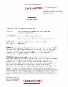 |CitationClass=تم تجاهله (مساعدة) - Barrett, Devlin; Zapotosky, Matt; Leonnig, Carol D.; Dawsey, Josh (25 September 2019). "Trump offered Ukrainian president Justice Dept. help for Biden investigation, memo shows". Washington Post. مؤرشف من الأصل في 27 سبتمبر 2019. اطلع عليه بتاريخ 25 سبتمبر 2019. الوسيط