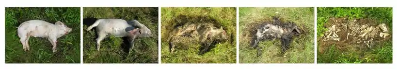 إذا تمكنت الحشرات من الوصول ، تفقس اليرقات وتبدأ في التغذي على أنسجة الجسم. نشاط اليرقة ، الذي يقتصر عادةً على الفتحات الطبيعية والكتل الموجودة تحت الجلد ، يتسبب في انزلاق الجلد وانفصال الشعر عن الجلد. تؤدي تغذية اليرقات وتراكم الغازات داخل الجسم في النهاية إلى تمزق الجلد بعد الذبح والذي سيسمح بعد ذلك بإخراج الغازات والسوائل إلى البيئة المحيطة. تسمح التمزقات في الجلد للأكسجين بالدخول مرة أخرى إلى الجسم وتوفير مساحة أكبر لتطوير يرقات الذباب ونشاط الكائنات الحية الدقيقة الهوائية. ينتج عن تطهير الغازات والسوائل روائح مميزة قوية مرتبطة بالتحلل. [7]