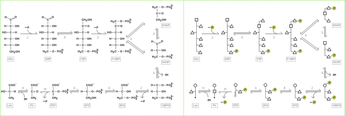 إن استخدام الرموز في هذه المعادلة يجعل الأمر يبدو غير متوازن فيما يتعلق بذرات الأكسجين، وذرات الهيدروجين والشحنات. إن تعادل الذرة يحفظ بمجموعتي الفوسفات(Pi ):[9]
