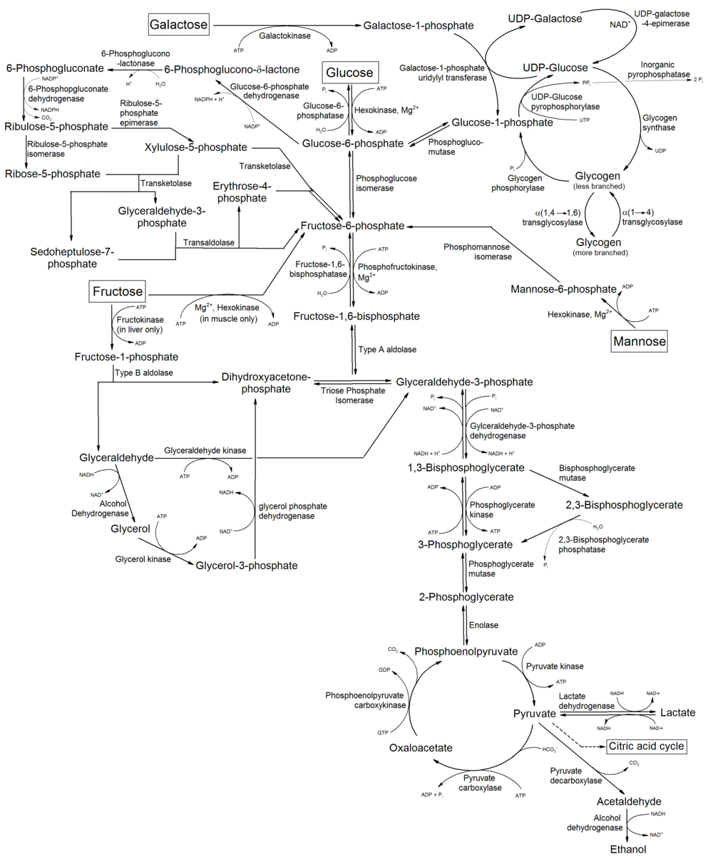 | أيض السكريات الأحادية المعروفة، وتتضمن استحداث الجلوكوز وتكون الغليكوجين وتحلل الغليكوجين. |