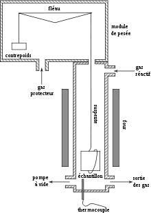 وبصرف النظر عن برمجة الفرن، فإن العينة توضع في فرن يسخن كهربائيا ومزود بمزدوجة حرارية تقيس درجة الحرارة بدقة. وقد توضع عينة مرجعية أيضا على كفة ميزان آخر في غرفة معزولة عن غرفة العينة. وقد يغمر جو العينة بغاز خامل بغرض عدم تأكسد العينة أو بغرض منع حدوث تفاعل آخر غير مرغوب فيه. وقد ابتكر جهاز آخر يستخدم فيه ميزان حساس يعمل ببلورة من الكوارتز، يستطيع قياس عينات صغيرة يبلغ وزنها عدة ميكروجرام بالمقارنة بالأجهزة المعتادة التي تقيس عينات وزنها عدة مليجرامات. [3]