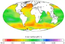 منذ بداية الثورة الصناعية، امتصت المحيطات نحو ثلث ثاني أكسيد الكربون الذي أنتجته البشرية منذ ذلك الحين، ويُقدر أن الرقم الهيدروجيني (pH) لأسطح المحيطات قد انخفض بأكثر من 0.1 بقليل على المقياس اللوغارتمي له، والتي تمثّل زيادة بنسبة 29% في أيون الهيدروجين (H+). يتوقّع أن ينخفض الرقم الهيدروجيني بمقدار 0.3 إلى 0.5.