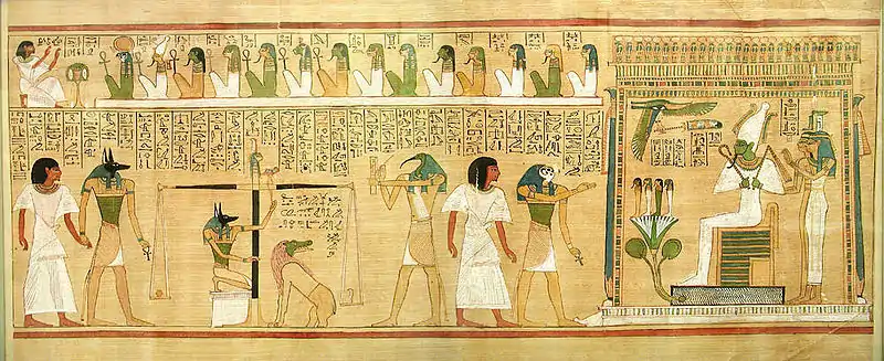 اعتبر قدماء المصريين أن الإله تحوت هو الذي علمهم الكتابة والحساب (أنظر الحساب عند قدماء المصريين)، وهو يصور دائما ماسكا بالقلم ولوح يكتب عليه. له دور أساسي في محكمة الموتى حيث يؤتى بالميت بعد البعث لإجراء عملية وزن قلبه أمام ريشة الحق ماعت. ويقوم تحوت بتسجيل نتيجة الميزان. إذا كان قلب الميت أثقل من ريشة الحق - فيكون من المخطئين العاصين - يُلقى بقلبه إلى وحش مفترس تخيلي اسمه عمعموت فيلتهمه وتكون هذه هي النهاية الأبدية للميت. أما إذا كان القلب أخف من ريشة الحق (ماعت) فمعنى ذلك أن الميت كان صالحا في الدنيا فيدخل الجنة يعيش فيها مع زوجته وأحبابه، بعد أن يستقبله أوزيريس.
