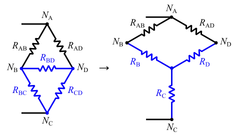 الفكرة العامة هي إيجاد المقاومة لأي عنصرين , بشرط أن يكونوا متجاورين من المعادلة التالية: