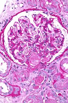 ![]() صورة مجهرية showing an acute thrombotic microangiopathy, the علم الأنسجة correlate of DIC, in a خزعة كلوية. A خثرة is present in the نقير of the كبيبة (توضيح) (center of image). PAS stain. صورة مجهرية showing an acute thrombotic microangiopathy, the علم الأنسجة correlate of DIC, in a خزعة كلوية. A خثرة is present in the نقير of the كبيبة (توضيح) (center of image). PAS stain. | |