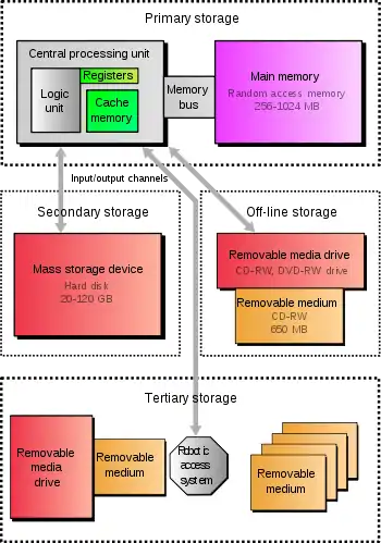 وحدة المعالجة المركزية في جهاز الكمبيوتر هي ما تعالج البيانات عن طريق إجراء العمليات الحسابية أو الحاسوبية، في الواقع، تقريبا جميع أجهزة الكمبيوتر تستخدم التسلسل الهرمي للتخزين (Memory hierarchy)، والتي تضع خيارات وسائط تخزين سريعة وباهظة الثمن قريبا من وحدة المعالجة المركزية، ووسائط تخزين ابطئ ولكن خيارات أكبر وأرخص وابعد عن وحدة المعالجة المركزية، عموما التكنولوجيات سريعة الزوال (التي تزول مع زوال الطاقة الكهربية) والتي يطلق عليها الذاكرة بينما يشار للتقنيات الأبطئ وحدة التخزين، ولكن بعض الاحيان يطلق على التخزين الثابتة ذاكرة تخزينية.