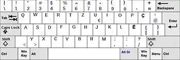 تستخدم لوحات المفاتيح تخطيطًا يُعرف باسم QÜERTY ، حيث تظهر Ü بدلاً من W فوق S ، مع عدم وجود المفتاح W على الإطلاق. والتخطيط مدعوم من قبل Microsoft Windows.[6]