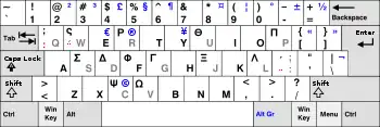 يتبع المخطط اليوناني المعتاد تخطيط الولايات المتحدة للأحرف المتعلقة بالأحرف اللاتينية (ABDEHIKLMNOPRSTXYZ ، ΑΒΔΕΗΙΚΛΜΝΟΠΡΣΤΧΥΖ ، على التوالي) ، ويستبدل الحروف المشابهة صوتيًا (Φ في F ؛؛ في G)يحتوي تخطيط Polytonic اليوناني على العديد من المفاتيح الميتة لإدخال الحروف المحركة. هناك أيضًا التصميم اليوناني 220 والتخطيط اليوناني 319.[6]