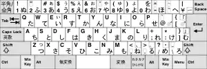 يتضمن تخطيط JIS القياسي الكانا الياباني بالإضافة إلى تصميم نمط QWERTY.للكتابه باللغلة اليابانية، الطريقة الأكثر شيوعًا هي إدخال النص صوتيًا، كما kana بالحروف اللاتينية، والتي يتم تحويلها بعد ذلك إلى kanji بواسطة محرر. من الممكن أيضًا كتابة kana مباشرةً ، اعتمادًا على الوضع المستخدم. لكتابة た か は し أو "Takahashi" ، وهو اسم ياباني ، يمكن للمرء أن يكتب إما TAKAHAS (H) I في وضع إدخال (Romanized) (Rōmaji) ، أو QTFD في وضع إدخال kana. ثم يمكن للمستخدم متابعة خطوة التحويل لتحويل المدخلات إلى كانجي المناسبة.