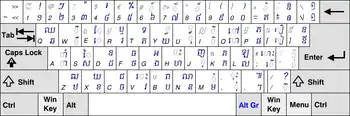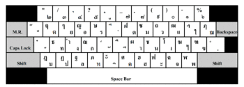 يتم الوصول إلى الأحرف الأقل استخدامًا بواسطة مفتاح Shift. على الرغم من استخدامها على نطاق واسع باللغة التايلاندية، إلا أن الأرقام العربية غير موجودة في القسم الرئيسي من لوحة المفاتيح. بدلاً من ذلك، يتم الوصول إليهم عبر لوحة المفاتيح الرقمية أو عن طريق التبديل إلى مجموعة الأحرف اللاتينية.