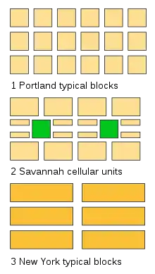 تكاليف الشوارع عامة تعتمد على أربعة متغيرات: عرض الشارع ومدى الشارع وعرض المربع السكني وعرض الرصيف. يسهل عنصران جوهريان للنظام المصبعي، كثرة التقاطع وهنداسة متعامدة، تنقل المشاة. وكذلك، تساعد هذه الهنداسة في التوجه والملاحة، وتساعد كثرة التقاطع في اختيار طريق مباشر إلى الجهات المرغوب فيها.