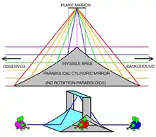 وعلى الرغم من أن العباءة نفسها غير خفية أى أنها ترى مرئيا، فإنها تخفي الأشياء الموضوعة تحتها .[3]