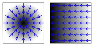 في الصورتين أعلاه، الحقل القياسي باللونين الأسود والأبيض والحقل المتجهي باللون الأزرق. اللون الأسود يعبر عن قيم عالية. والأسهم الزرقاء تمثل التدرج المقابل.