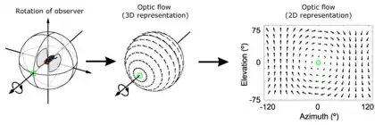 تدفق بصري ملاحظ من قبل مراقب يدور (الذبابة). يمثل اتجاه وكمية التدفق البصري في كل نقطة باستخدام متجه ذو اتجاه وطويلة معينة.