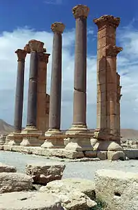 There is no evidence that Germanicus visited Palmyra.[140]</ref>[141] وقد أقام الفيلق الروماني العاشر في تدمر بعد ذلك بعام،[note 7]</ref>[142] على أن التدخّل الروماني في شؤون تدمر ظلَّ قليلاً ما عدا جباية الضرائب[143] وبناء طريق يصلُ بين تدمر وصورا في سنة 75م[note 8]</ref>[144] كما عبَّأ الرومان أهل تدمر في جيوشهم،[145] على أنَّهم لم ينصِّبوا حاكماً أو بريفيكتوس ليقيمَ في المدينة (على عكس ما درجت عليه العادة في مدنهم).[144] وقد كان القرن الأول للميلاد حافلاً بالعمارة والبنيان، وشُيِّد فيه معبد بعل الشهير (وقد اكتمل في سنة 32م)[102] وأول سور للمدينة،[146] ونمت تدمر في تلك الفترة من واحة صغيرة للقوافل إلى مركز تجاري مزدهر،[note 9]</ref>[127] بل وشرع تجارُّها بتأسيس فروعٍ ومستوطناتٍ لهُم في المدن التجارية المجاورة.[141]