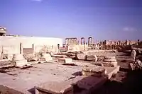 - دُمّر "معبد نابو" إلى حدٍ كبير.[108] كان المعبد في الاتجاه الشرقي حسب مخططه؛ يقود السياج الخارجي إلى منصة طولها 20 متراً عبر رواق، لا تزال قواعد أعمدته قائمة.[109] تفتح قاعة البهو المعمّد على المذبح الخارجي.[109]