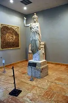 - "معبد اللات" مدمّر إلى حدٍ بعيد ولم يتبقَّ منه سوى منصّة واحدة، وبضعة أعمدة وإطار الباب فقط.[28] داخل المجمّع، تمّ حفر أسد عملاق (أسد اللات وقد أُنقِذ من جدار مجمّع المعبد.[107][110]