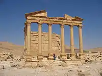 - تم تخصيص "معبد بل" عام 32 ميلادي؛[102] وكان يتكون من منطقة كبيرة بمحاطة ببورتيكوس. كان المعبد مستطيل الشكل ويتّجه شمال-جنوب. بلغ طول الجدار الخارجي حوالي 205 متراً يتضمن بوابة،[103] أما الغرفة الداخلية فتقع في منتصف المنطقة.[104]