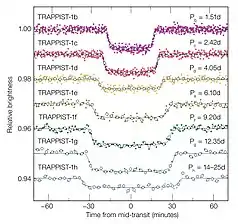 يوضح هذا الرسم البياني كيف يتلاشى ضوءالنجم القزم الفائق البرودة ترابيست-1 عند مرور كواكبة السبعة من أمامة وحجبها بعض ضوء النجم .الكواكب الأكبر تخلق انخفظات أكبر والأبعد يطول عبورها (بيانات مقراب سبيتزر الفضائي).