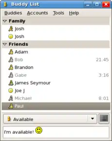 مصطلح "المراسلة الفورية" هو علامة الخدمة من شركة تايم وارنر [2]، وربما لا يمكن استخدامها في برامج ليست تابعة لأمريكا أون لاين في الولايات المتحدة. لهذا السبب، عملاء الرسائل الفورية كانت تعرف سابقا باسم غايم Gaim أو غايم gaim أعلنت في نيسان 2007 التي سيطلق عليها اسم ["بجين"] [3]
