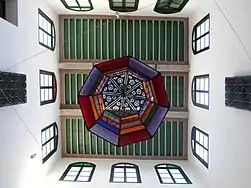 يوجد أمام بهو الدخول حائط خشبي يعوض الحائط الحجري في قاع الغرفة ويفصل بين تربة عزيزة عثمانة وزاوية بن عروس.[1]