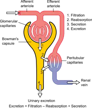 يدفع ارتفاع الضغط الهيدروليكي الجزيئات الصغيرة في السوائل الأنبوبية مثل الماء، السكر، الأحماض الأمينية، كلوريد الصوديوم واليوريا من خلال مصفاة، بداية من الدم في المحفظة الكبيبية عبر الغشاء القاعدي من محفظة بومان إلى الأنابيب الكلوية. تسمى هذه العملية عملية الترشيح الفائق أو الترشيح المستدق، السائل الناتج يكون خالي تقريبا من البروتينات الكبيرة وخلايا الدم، ويشار إليه باسم الرشاحة الكبيبية، أو الرشاحة المستدقة.[1] التعديل الإضافي للرشاحة المستدقة بعد ذلك، من خلال إعادة الامتصاص والإفراز يحولها إلى بول.