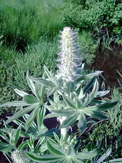 نبات معمر قائم. الساق والأوراق مغطاة بوبر صوفي كثيف. النورة عذقة عنقودية. الأزهار بنفسجية. النبات سام للحيوانات.