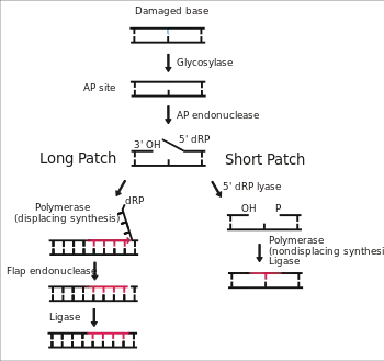 يمكن أن تتضر قواعد منفردة في الدنا بآليات عديدة، أشهرها: نزع الأمين، الأكسدة والألكلة. يمكن أن تؤثر هذه التعديلات على قدرة القاعدة في الترابط بواسطة الروابط الهيدروجينية، وهو ما ينتج عنه ترابط غير صحيح وكنتيجة لذلك طفرات في الدنا. على سبيل المثال: ترابط 8-أوكسو غوانين مع الأدينين (في الصورة) بدل السايتوسين، يسبب أثناء التضاعف استبدال (طفرة) الزوج القاعدي G:C بـ T:A. أمثلة أخرى على تضررات القاعدة التي يصلحها بير تشمل: