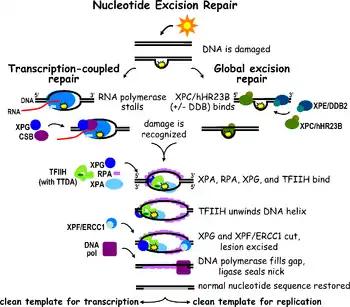 ترميم استئصال النوكليوتيد (نير) هي آلية استئصال هامة بشكل خاص تقوم بنزع الدنا المتضرر المُسبَّبِ بواسطة الأشعة فوق البنفسجية. يُنتج ضرر الأشعة فوق البنفسجية نواتج إضافة دنا متكتلة، وهذه النواتج في الغالب مثنويات الثايمين و4،6-نواتج فوسفور. يقود التعرف على الضرر إلى إزالة قطعة قصيرة من سلسلة دنا منفردة والتي تحتوي على الرابطة. السلسلة غير المتضررة تبقى ويستخدمها بوليميراز الدنا كقالب لاصطناع تسلسل مكمل قصير. يتم الربط النهائي لإكمال ترميم نير وتشكيل سلسلة دنا مزدوجة بواسطة ليغاز الدنا. يمكن تقسيم نير إلى مسارين فرعيين: نير جينوم عام (جج-نير أو ججر - GG-NER or GGR) ونير مزدوج النسخ (تس-نير أو تسر - TC-NER or TCR). يحتلف هذان المساران الفرعيان في طريقة تعرفهما على تضرر الدنا لكنهما يشتركان في نفس عملية قص، ترميم، وربط الروابط.