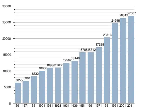 في سنة 1861 بلغ عدد السكان 6٬355 نسمة، وتطور العدد ليصل في سنة 2011 لـ 27٬007 نسمة.