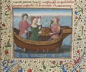 ![]() تريستان وإيزولت يلعبان الشطرنج أثناء احتساء ترياق الحب على متن سفينة (صورة منمنمة، 1470) | |