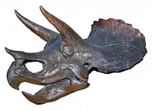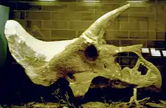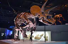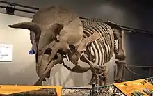 ![]() هيكلٌ عظميٌّ للتريسيراتوپس الكامل (Triceratops prorsus) مُركَّب في متحف التاريخ الطبيعي بِلوس أنجلوس | |