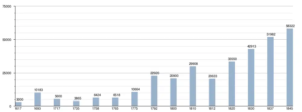 في سنة 1617 بلغ عدد السكان 3٬000 نسمة، وتطور العدد ليصل في سنة 1845 لـ 58٬322 نسمة.