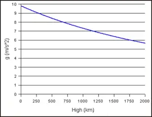 تنخفض g بالقرب من سطح الأرض بمعدل 1 و3 ميكرومتر/الثانية2 لكل 1 متر ارتفاع. ويمكن حساب تغير g على الارتفاعات الكبيرة بواسطة قانون الجذب العام لنيوتن، أنظر الشكل.