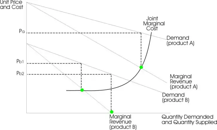 عند تحديد الأسعار في حالة معقدة مثل تلك، يكون التحليل الاقتصادي الجزئي الهامشي مفيدًا. وفي حالة بسيطة تحتوي على منتج واحد، يجري تحديد السعر بناء على الكمية المطلوبة حيث تساوي التكلفة الحدية الإيراد الحدي تمامًا. وهذا هو بالضبط ما يحدث عندما يجري إنتاج المنتجات المشتركة بنسب متفاوتة. حيث يجري التعامل مع كل منتج على حدة. وفي الواقع، قد يكون من الممكن وضع تكلفة منفصلة. في الرسم البياني أدناه، لتحديد التسعير الأمثل للمنتجات المشتركة المنتجة بنسب متغيرة، تجد نقطة تقاطع الإيرادات الحدية (المنتج A) مع منحنى التكلفة الحدية المشتركة. إنك تقوم بعد ذلك بزيادة هذه الكمية، حتى تصل إلى منحنى الطلب على المنتج A؛ وبذلك تحصل على سعر تعظيم الربح للمنتج A (النقطة Pa في الرسم البياني). ثم تقوم بفعل نفس الشيء بالنسبة للمنتج B، فتحصل على السعر عند النقطة PB1.