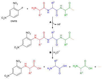 هناك العديد من الكواشف المختلفة التي يمكن استخدامها لتسمية الأحماض الأمينية الطرفية. تتفاعل جميعها مع مجموعات الأمين وبالتالي ترتبط أيضًا بمجموعات الأمين في السلاسل الجانبية للأحماض الأمينية مثل الليسين - ولهذا السبب من الضروري توخي الحذر في تفسير اللونيات لضمان اختيار المكان الصحيح. اثنان من الكواشف الأكثر شيوعًا هما كاشف سانجر (1 فلورو -2,4 - دينترو بنزين) ومشتقات دانسيلي مثل كلوريد دانسيلي. ويمكن استخدام Phenylisothiocyanate ، كاشف لتدهور إدمان. تنطبق الأسئلة نفسها هنا كما في تحديد تركيبة الأحماض الأمينية، باستثناء أنه لا توجد حاجة إلى البقع، حيث تنتج المواد الكاشفة مشتقات ملونة ولا يتطلب سوى التحليل النوعي. لذلك ليس من الضروري أن تتم إزالة الحمض الأميني من عمود اللوني، مقارنة فقط بالمعيار. هناك اعتبار آخر يأخذ بعين الاعتبار أنه بما أن أي مجموعات أمينية سوف تتفاعل مع كاشف الوسم، فلا يمكن استخدام اللوني التبادلي التبادلي، ويجب استخدام كروماتوجراف طبقة رقيقة أو كروماتوغرافي سائل عالي الضغط بدلاً من ذلك.