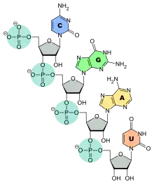 على عكس الدنا فإن الحمض النووي الريبوزي (رنا) يوجد كشريط أحادي (single strand)، تتراص القواعد النيتروجينية علية، على ضلع واحد (فليس له تركيب لولبي مزدوج) (أنظر الشكل).[1]