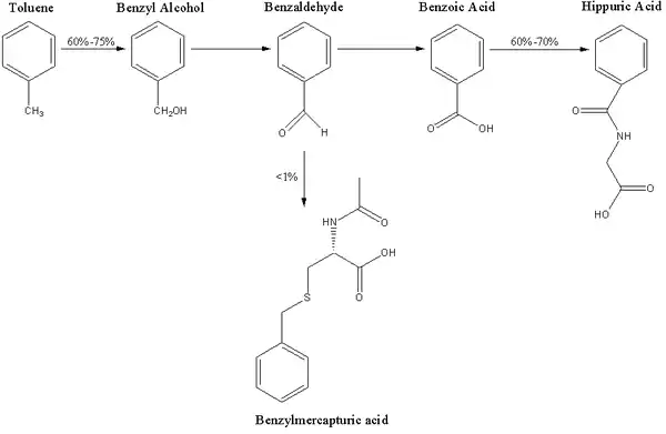 يعتبر حمض الهيبوريك هو المستقلب البولي الرئيسي للتولوين.[5]