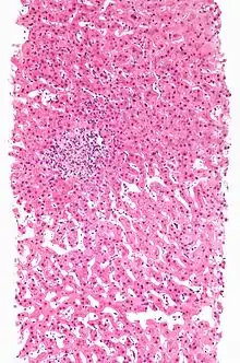 في هذا النمط، يرتبط نخر الكبد مع انتشار الخلايا الالتهابية. يمكن أن يكون هناك ثلاثة أنواع من التهاب الكبد الناتج عن الأدوية. (أ) التهاب الكبد الفيروسي هو الأكثر شيوعًا، حيث الميزات النسيجية مشابهة لالتهاب الكبد الفيروسي الحاد. (ب) في التهاب الكبد البؤري أو غير المحدد، بؤر متفرقة من نخر الخلية وقد تصاحبها الخلايا اللمفاوية. (ج) التهاب الكبد المزمن وهو مشابه جدًا لالتهاب الكبد المناعي الذاتي سريريًا، مَصْليًا، وتشريحيًا.