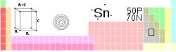 - «1»: القَصْدِير هو عنصر كيميائي له الرمز Sn والعدد الذرّي 50؛ ويقع في الجدول الدوري في مجموعة الكربون (مجموعة العناصر الرابعة عشرة؛ أو المجموعة الرابعة وفق ترقيم المجموعات الرئيسية)، ويُصنَّف من الفلزات بعد الانتقالية.