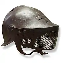 خوذة من تصميم لوبلاتونييه، معروضة في متحف مورز العسكري، سويسرا.