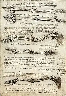 :120–121 بين عامي 1275 و1326، نفّذ المشرحون موندينودي لوتزي وأليساندروأتشيليني وأنطونيوبينفيني في بولونيا أول عملية تشريح بشري منهجية منذ العصور القديمة.[67][68][69] مثّل فيما بعد كتاب موندينوفي التشريح أول كتابٍ مدرسيّ في إعادة اكتشاف التشريح البشري في عصر النهضة، حيث وصف الكتاب الجسم البشري وفق الترتيب الآتي: البطن أولاً ثم الصدر ومن ثم الرأس والأطراف، مثّل هذا الكتاب كتاب التشريح المرجعيّ لقرن من الزمان.[66] تدرب ليوناردودافينشي (1452-1519) في التشريح على يد الرسام أندريا دل فروكيو.[66] واستفاد من معرفته التشريحية في أعماله الفنية، وقد رسم العديد من الرسومات التي صوّر فيها البنى الهيكلية والعضلات وأعضاء البشر وفقاريات أخرى قام بتشريحها.[66][70] يعتبر أندرياس فيزاليوس (اللاتينية: Andries van Wezel)(1514-1564) وهوأستاذ التشريح في جامعة بادوفا، يُعتبر مؤسس علم التشريح البشري الحديث.[71] نشر فيزاليوس كتابه المؤثر في التشريح في دوقية برابنت، وهوكتاب "بنية الجسم البشري" (اللاتينية: De humanicorporisfabrica) في سبعة مجلدات، عام 1543.[72] وقد رسم الرسوم التوضيحية المفصّلة والدقيقة في الكتاب الفنان جان فان كالكار أحد تلامذة تيتيان.[73]