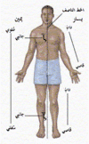 - طرف علوي — يشمل يد، ساعد، ذراع، كتف، إبط، صدر ولوح الكتف.