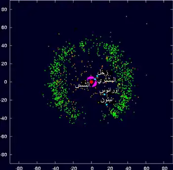 بعد نبتون، يستمر النّظام الشمسي في حزام كايبر، والقرص المتناثر، وسحابة أورط، وهي ثلاث مجموعات متفرقة من الأجسام الجليدية الصغيرة يعتقد أنها نقاط الأصل لمعظم المذنبات المرصودة. على مسافة بعيدة من الشمس، كان التراكم بطيئًا جدًا للسماح للكواكب بالتشكل قبل أن يتشتت السديم الشمسي، وبالتالي افتقر القرص الأولي إلى كثافة الكتلة الكافية للاندماج في كوكب.[66] يقع حزام كايبر بين 30 و55 وحدة فلكية من الشمس، بينما يمتد القرص المبعثر إلى أكثر من 100 وحدة فلكية، وتبدأ سحابة أورط البعيدة بحوالي 50000 وحدة فلكية.[67] في الأصل، كان حزام كايبر أكثر كثافة وأقرب إلى الشمس، مع حافة خارجية عند حوالي 30 وحدة فلكية. كان من الممكن أن تكون حافتها الداخلية وراء مداري أورانوس ونبتون، والتي كانت بدورها أقرب بكثير إلى الشمس عندما تشكلت (على الأرجح في نطاق 15-20 وحدة فلكية)، وفي 50٪ من عمليات المحاكاة انتهى بها الأمر في مواقع متقابلة، حيث كان أورانوس بعيدًا عن الشمس من نبتون.[63][68]