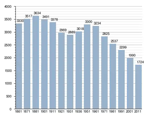 في سنة 1861 بلغ عدد السكان 3٬330 نسمة، وتطور العدد ليصل في سنة 2011 لـ 1٬724 نسمة.