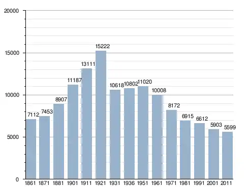 في سنة 1861 بلغ عدد السكان 7٬112 نسمة، وتطور العدد ليصل في سنة 2011 لـ 5٬599 نسمة.