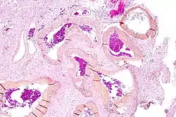 ![]() صورة مجهرية of an arteriovenous malformation in the brain. HPS stain. صورة مجهرية of an arteriovenous malformation in the brain. HPS stain. | |
